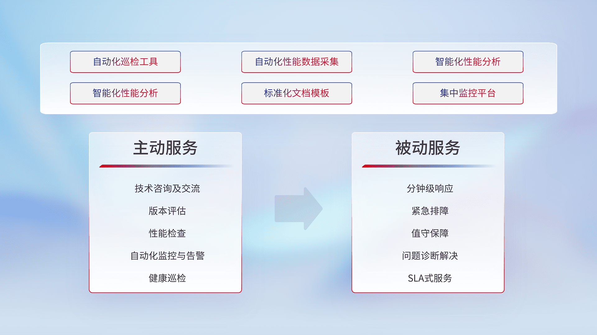 智能化工具和标准化文档,,保障服务质量,,,提供主动服务(包含技术咨询、、、版本评估、、、、性能检查、、自动化监控与告警、、、、健康巡检)和被动服务包含(分钟级响应、、、、紧急排障、、、、值守保障、、、问题诊断解决、、、、SLA服务)。。。。