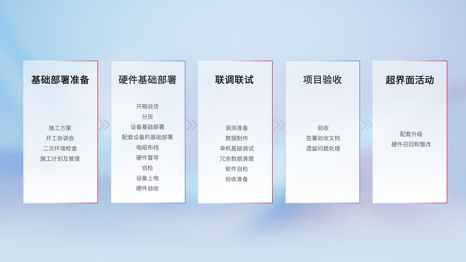 从基础部署准备、、、硬件基础部署、、联调联试、、、项目验收、、、、越界面活动的全过程可追溯,,,保证施工质量和进度。。。。